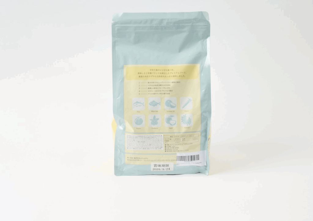 新鮮な魚(マグロ、白身魚)を主原料として使用しているため、フードの粒内に小さな白い粒(魚の骨)が見られることがあります。魚原料を使用したフードの特性とはいえ、見た目に敏感な飼い主さんには気になる要素となり得ます。
