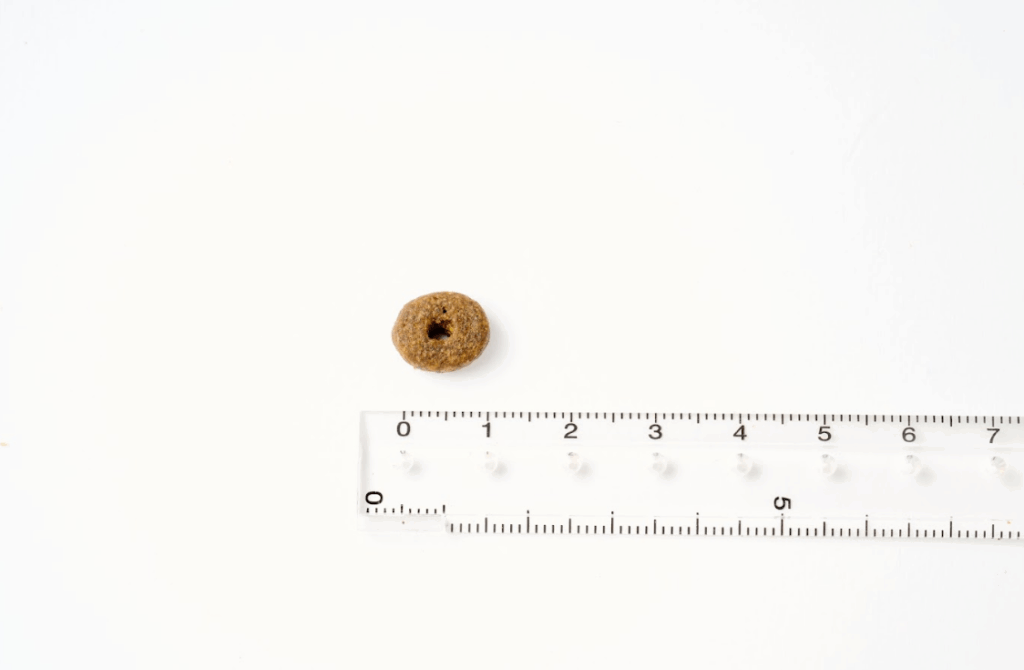 粒の形状はリング型で、サイズは直径約1cm、厚さ約4.5mmと、小型犬から大型犬まで食べやすいように配慮された設計となっています。全犬種・全年齢に対応しているため、多頭飼いのご家庭でも同じフードを与えられます。