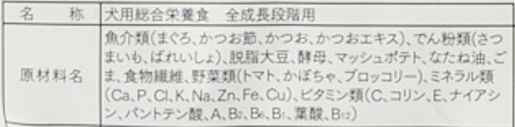 魚介類(まぐろ、かつお、かつお節、かつおエキス)、でん粉類(さつまいも、ばれいしょ)、脱脂大豆、酵母、マッシュポテト、なたね油、ごま、食物繊維、野菜類(トマト、かぼちゃ、ブロッコリー)、ミネラル類(Ca、P、Cl、K、Na、Zn、Fe、Cu)、ビタミン類(C、コリン、E、ナイアシン、パントテン酸、A、B2、B6、B1、葉酸、B12)