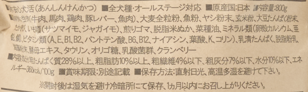 「安心犬活」は800gの販売のみとなっており、中型〜大型犬を飼っている家庭では、すぐに使い終わってしまう印象を受けました。特に食べ盛りの大型犬には少し物足りないサイズかもしれません。