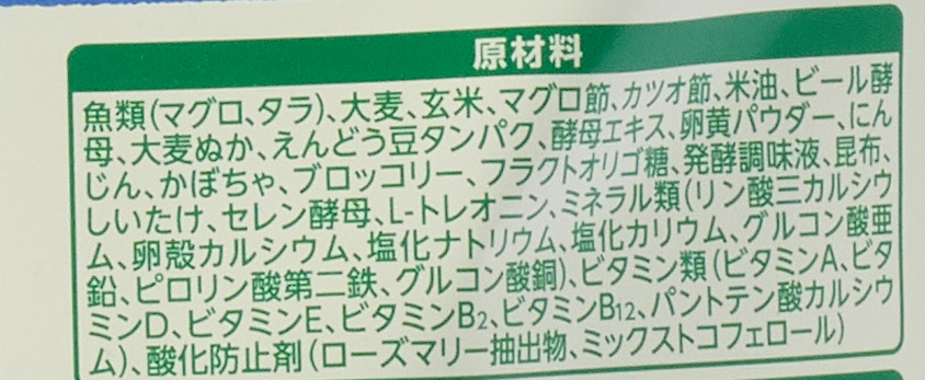 鶏肉、大麦、玄米、カツオ節、ビール酵母、大麦ぬか、えんどう豆タンパク、鶏がらスープ、酵母エキス、米油、卵黄パウダー、にんじん、かぼちゃ、ブロッコリー、フラクトオリゴ糖、発酵調味液、昆布、しいたけ、セレン酵母、L-トレオニン、ミネラル類(リン酸三カルシウム、卵殻カルシウム、塩化ナトリウム、塩化カリウム、グルコン酸亜鉛、ピロリン酸第二鉄、グルコン酸銅)、ビタミン類(ビタミンA、ビタミンD、ビタミンE、ビタミンB2、ビタミンB12、パントテン酸カルシウム)、酸化防止剤(ローズマリー抽出物、ミックストコフェロール)