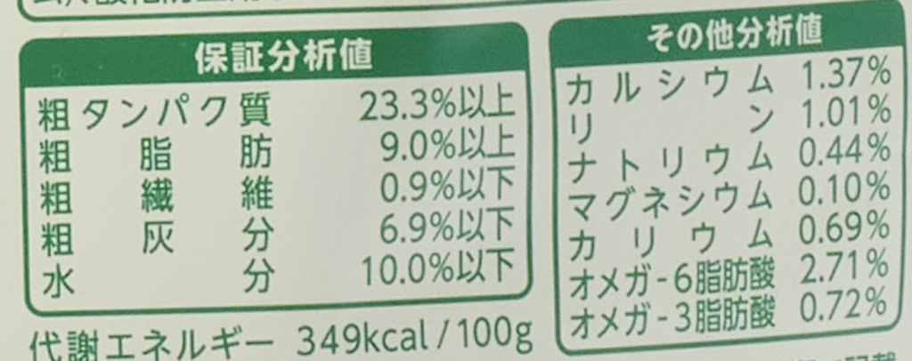 切り替えによる便の変化もなく、おなかの調子を保ちながら問題なく切り替えができたと感じます。普通の健康維持職としては十分に思いますが、皮膚や被毛をサポートする栄養素の記載は少なめです。オメガ3脂肪酸は0.44%とやや控えめで、抗炎症作用も強くはないのでアレルギー体質や乾燥肌など、皮膚トラブルに悩む子へのケアとしては少々物足りない部分はあります。