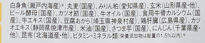 白身魚(瀬戸内海産)、丸麦(国産)、みりん粕(愛知県産)、玄米(山形県産・他)、ビール酵母(国産)、カツオ節(国産)、牛オイル(国産)、食用牛骨カルシウム(国産)、牛エキス(国産)、豆腐おから(埼玉県神泉村産)、鶏肝臓(広島県産)、カツオエキス(静岡県焼津市産)、米油(国産)、さつま芋(国産)、にんじん(千葉県産・他)、昆布(北海道産・他)、ビタミン・ミネラル類(栄養添加物は総量の1.5%以内)※塩化カリウム、グルコン酸亜鉛、ピロリン酸第二鉄、ビタミンE、ビタミンB12,グルコン酸銅、ビタミンA、パントテン酸カルシウム、ビタミンD、ビタミンB2