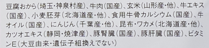 豆腐おから(埼玉・神泉村産)、牛肉(国産)、玄米(山形産・他)、牛エキス(国産)、小麦胚芽(北海道産・他)、食用牛骨カルシウム(国産)、牛オイル(国産)、にんじん(千葉産・他)、昆布・ワカメ(北海道産・他)、カツオエキス(静岡・焼津産)、豚腎臓(国産)、豚肝臓(国産)、ビタミンE(大豆由来・遺伝子組換えでない)