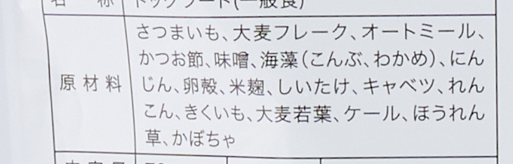 さつまいも、大麦フレーク、オートミール、かつお節、味噌、海藻(こんぶ、わかめ)、にんじん、卵殻、米麴、しいたけ、キャベツ、れんこん、きくいも、大麦若葉、ケール、ほうれん草、かぼちゃ