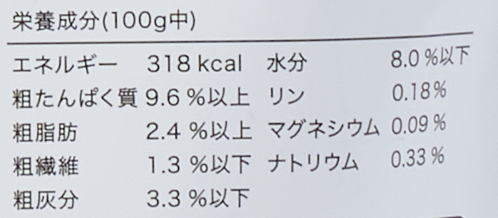 | 水分 | 8.0%以下 | 代謝エネルギー(ME) | 318kcal/100g |