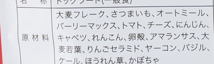 大麦フレーク、さつまいも、オートミール、バーリーマックス、トマト、チーズ、にんじん、キャベツ、れんこん、卵殻、アマランサス、大麦若葉、りんごセラミド、ヤーコン、バジル、ケール、ほうれん草、かぼちゃ