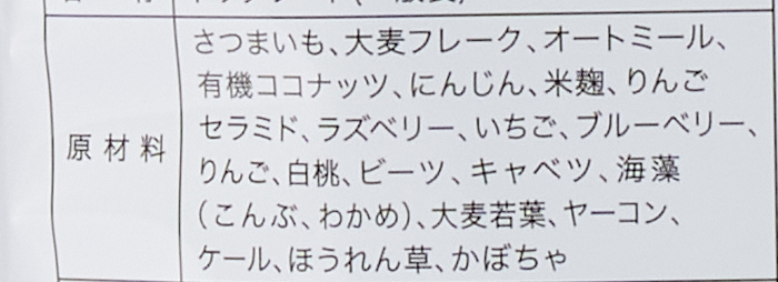 さつまいも、大麦フレーク、オートミール、有機ココナッツ、にんじん、米麹、りんごセラミド、ラズベリー、いちご、ブルーベリー、りんご、白桃、ビーツ、キャベツ、海藻(こんぶ、わかめ)、大麦若葉、ヤーコン、ケール、ほうれん草、かぼちゃ