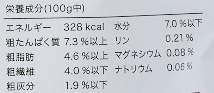 | 水分 | 7.0%以下 | 代謝エネルギー(ME) | 328kcal/100g |