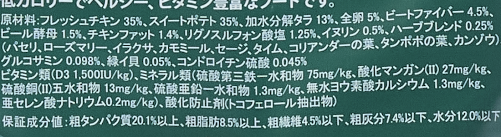 フレッシュチキン 35%、スイートポテト 35%、加水分解タラ 13%、全卵 5%、ビートファイバー 4.5%、ビール酵母 1.5%、チキンファット 1.4%、リグノスルフォン酸塩 1.25%、イヌリン 0.5%、ハーブブレンド 0.25%(パセリ、ローズマリー、イラクサ、カモミール、セージ、タイム、コリアンダーの葉、タンポポの葉、カンゾウ)、グルコサミン 0.098%、緑イ貝 0.05%、コンドロイチン硫酸 0.045%