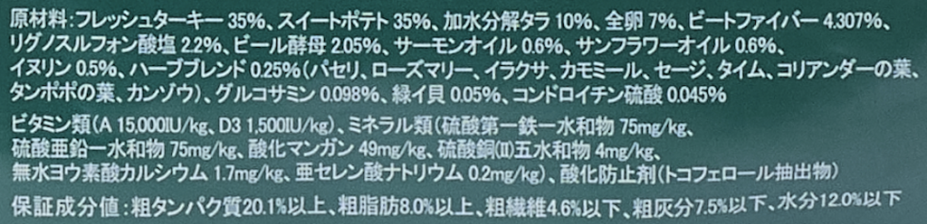 フレッシュターキー35%、スイートポテト35%、加水分解タラ10%、全卵7%、ビートファイバー4.307%、リグノスルホン酸塩2.2%、ビール酵母2.05%、ビタミン類2.05%、サーモンオイル0.6%、サンフラワーオイル0.6%、イヌリン0.5%、ハーブブレンド0.25%(パセリ、ローズマリー、イラクサ、カモミール、セージ、タイム、コリアンダーの葉、タンポポの葉、カンゾウ)、トコフェロール抽出物(酸化防止剤)0.25%、グルコサミン0.098%、緑イ貝0.05%、コンドロイチン硫酸0.045%