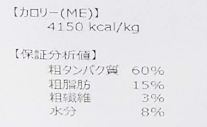 | 粗たんぱく質 | 60% | 粗脂質 | 15% |