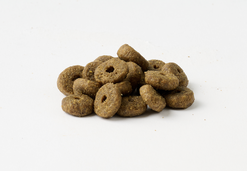 粒はやや大きめ(直径約1.2cm)ですが、中央に穴が開いたドーナツ型になっているため、指で割ることも可能。まだ噛む力が弱い時期や、フードの切り替え初期にも対応しやすいのが魅力です。さらに、人工添加物は一切使用されていないため、体が敏感な子犬にも配慮された設計となっています。