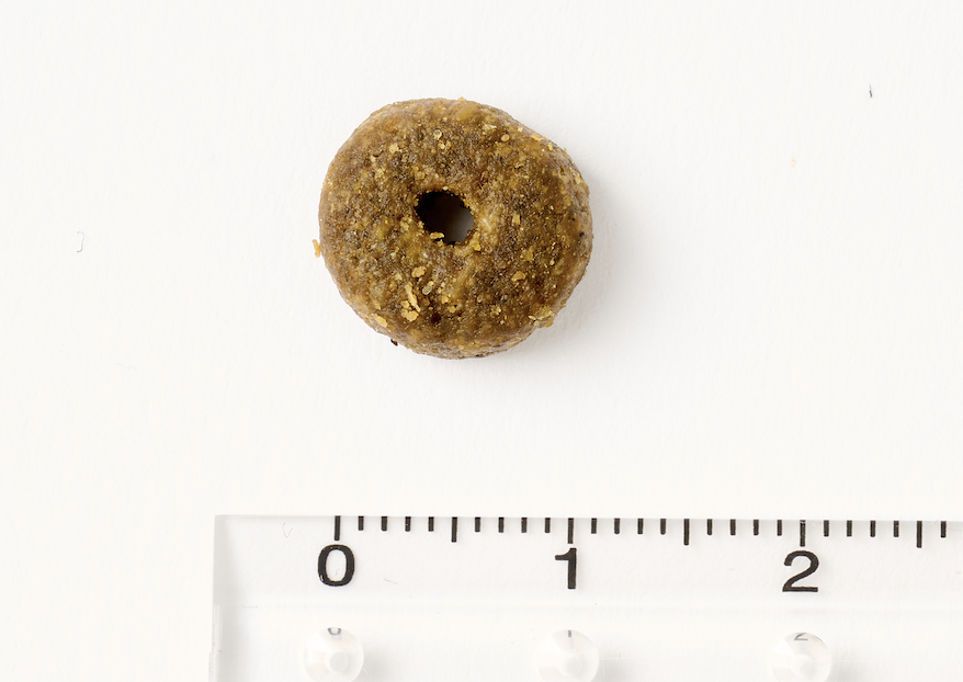 粒はやや大きめで、直径はおよそ1.2cmほど。中央に穴が開いたドーナツ型になっていて、一般的な粒よりも咀嚼を促す構造です。この形のおかげで、小さな口の子犬の子でもしっかり噛めて、成犬の子も噛む音を立てながら楽しそうに食べていました。