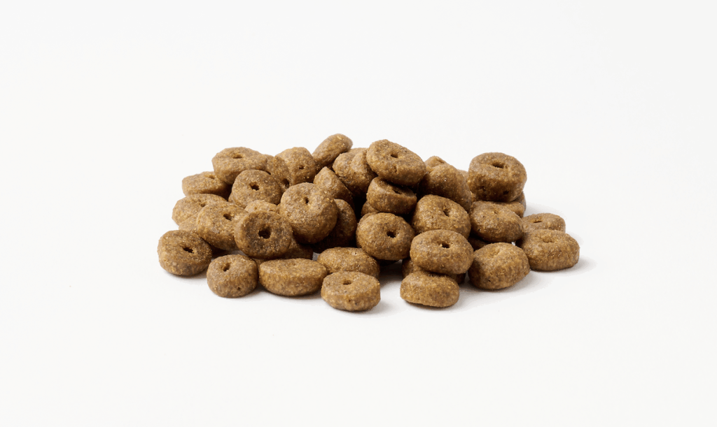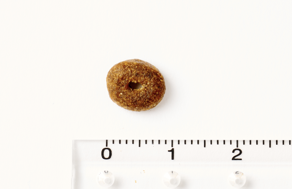 フードは小粒のドーナツ型で、中心に穴があいていることで噛みやすく、表面はさらっとしていて、脂っぽさやベタつきはありません。