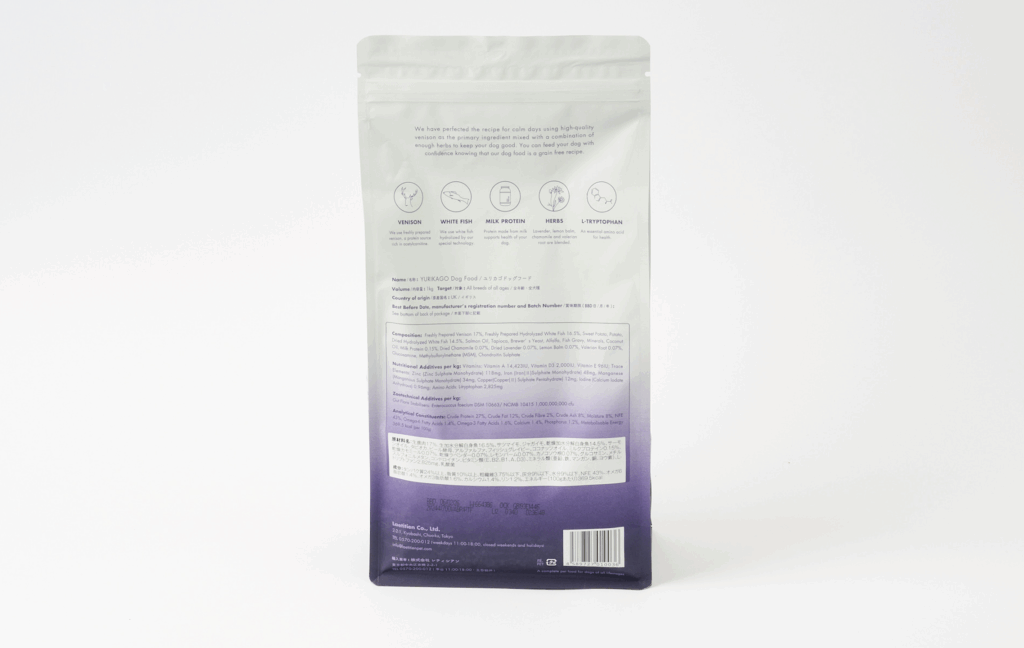 ユリカゴ ドッグフードは全年齢対応の一般食で、子犬にも安心して与えられる設計です。主原料の鹿肉や白身魚は高タンパク・低脂肪で消化にも優れており、成長期の体づくりをサポートしてくれる栄養バランスが魅力です。