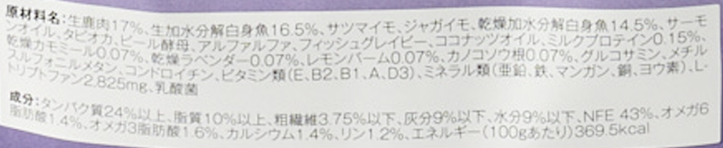 生鹿肉17%、生加水分解白身魚16.5%、サツマイモ、ジャガイモ、乾燥加水分解白身魚14.5%、サーモンオイル、タピオカ、ビール酵母、アルファルファ、フィッシュグレイビー、ココナッツオイル、ミルクプロテイン0.15%、乾燥カモミール0.07%、乾燥ラベンダー0.07%、レモンバーム0.07%、カノコソウ根0.07%、グルコサミン、メチルスルフォニルメタン、コンドロイチン、ビタミン類(E、B2、B1、A、D3)、ミネラル類(亜鉛、鉄、マンガン、銅、ヨウ素)、L-トリプトファン2,825mg、乳酸菌