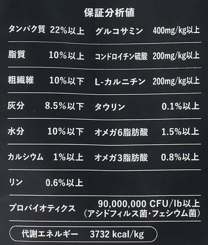 チキン生肉(骨抜き)、エンドウ豆、チキンミール、ポテト、ヒヨコ豆、タピオカ、エンドウ豆繊維、チキン脂肪、フラックスシード、アルファルファ、ナチュラルフレーバー、オオバコ種皮、ポテト粉、リンゴ、トマト、ニンジン、塩化ナトリウム、乾燥チコリ根、ビタミン類(ビタミンEサプリメント、L-アスコルビン酸-2-ポリリン酸塩(ビタミンC源)、ナイアシン、d-パントテン酸カルシウム、ビタミンAサプリメント、硝酸チアミン、リボフラビン、β-カロテン、ビタミンB12サプリメント、ビオチン、塩酸ピリドキシン、ビタミンD3サプリメント、葉酸)、ミネラル類(硫酸第一鉄、タンパク質キレート亜鉛、タンパク質キレート鉄、セレン酵母、酸化亜鉛、硫酸銅、タンパク質キレートマンガン、タンパク質キレート銅、酸化マンガン、ヨウ素酸カルシウム)、乾燥エンテロコッカス・フェシウム発酵生成物、乾燥ラクトバチルス・アシドフィルス発酵生成物、タウリン、DL-メチオニン、塩化コリン、チキン軟骨(コンドロイチン硫酸源)、グルコサミン塩酸塩、コンドロイチン硫酸塩、緑イ貝(ニュージーランド産)、L-カルニチン、ユッカシジゲラ抽出物、塩化カリウム、乾燥ローズマリー、酸化防止剤(ミックストコフェロール)