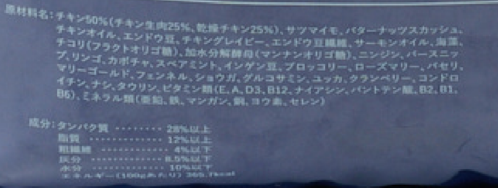 チキン50%(チキン生肉25%、乾燥チキン25%)、サツマイモ、バターナッツスカッシュ、チキンオイル、エンドウ豆、チキングレイビー、エンドウ豆繊維、サーモンオイル、海藻、チコリ(フラクトオリゴ糖)、加水分解酵母(マンナンオリゴ糖)、ニンジン、パースニップ、リンゴ、カボチャ、スペアミント、インゲン豆、ブロッコリー、ローズマリー、パセリ、マリーゴールド、フェンネル、ショウガ、グルコサミン、ユッカ、クランベリー、コンドロイチン、ナシ、タウリン、ビタミン類(E、A、D3、B12、ナイアシン、パントテン酸、B2、B1、B6)、ミネラル類(亜鉛、鉄、マンガン、銅、ヨウ素、セレン)