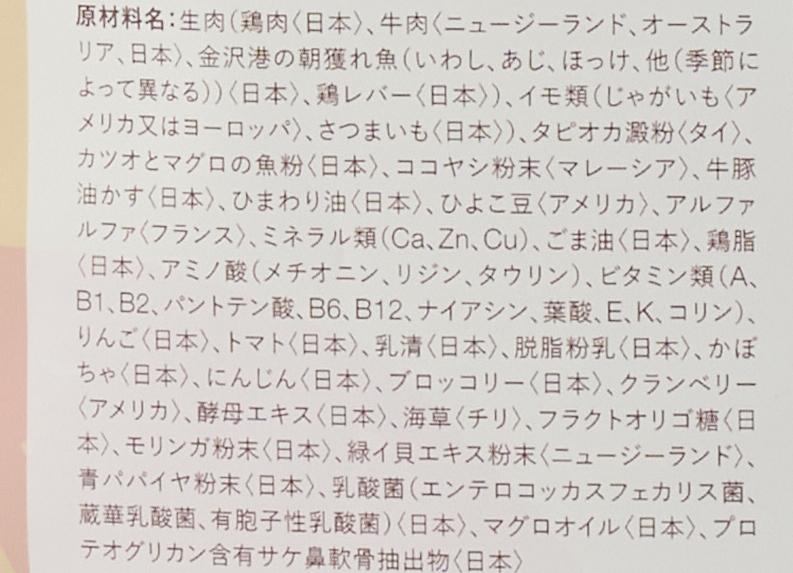 生肉(鶏肉〈日本〉、牛肉〈ニュージーランド、オーストラリア、日本〉、金沢港の朝獲れ魚(いわし、あじ、ほっけ、他(季節によって異なる))〈日本〉、鶏レバー〈日本〉)、イモ類(じゃがいも〈アメリカ又はヨーロッパ〉、さつまいも〈日本〉)、タピオカ澱粉〈タイ〉、カツオとマグロの魚粉〈日本〉、ココヤシ粉末〈マレーシア〉、牛豚油かす〈日本〉、ひまわり油〈日本〉、ひよこ豆〈アメリカ〉、アルファルファ〈フランス〉、ミネラル類(Ca、Zn、Cu)、ごま油〈日本〉、鶏脂〈日本〉、アミノ酸(メチオニン、リジン、タウリン)、ビタミン類(A、B1、B2、パントテン酸、B6、B12、ナイアシン、葉酸、E、K、コリン)、りんご〈日本〉、トマト〈日本〉、乳清〈日本〉、脱脂粉乳〈日本〉、かぼちゃ〈日本〉、にんじん〈日本〉、ブロッコリー〈日本〉、クランベリー〈アメリカ〉、酵母エキス〈日本〉、海草〈チリ〉、フラクトオリゴ糖〈日本〉、モリンガ粉末〈日本〉、緑イ貝エキス粉末〈ニュージーランド〉、青パパイヤ粉末〈日本〉、乳酸菌(エンテロコッカスフェカリス菌、蔵華乳酸菌、有胞子性乳酸菌)〈日本〉、マグロオイル〈日本〉、プロテオグリカン含有サケ鼻軟骨抽出物〈日本〉