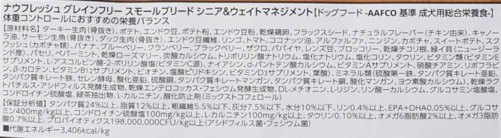 「ナウフレッシュ グレインフリー スモールブリード シニア&ウェイトマネジメント」は、パッケージ裏面に原材料が細かく記されています。多彩な食材の組み合わせにより、美味しさと栄養バランスを追求したドライフードです。適度なたんぱく質量を確保しつつ脂質やカロリーに配慮した設計が特長。