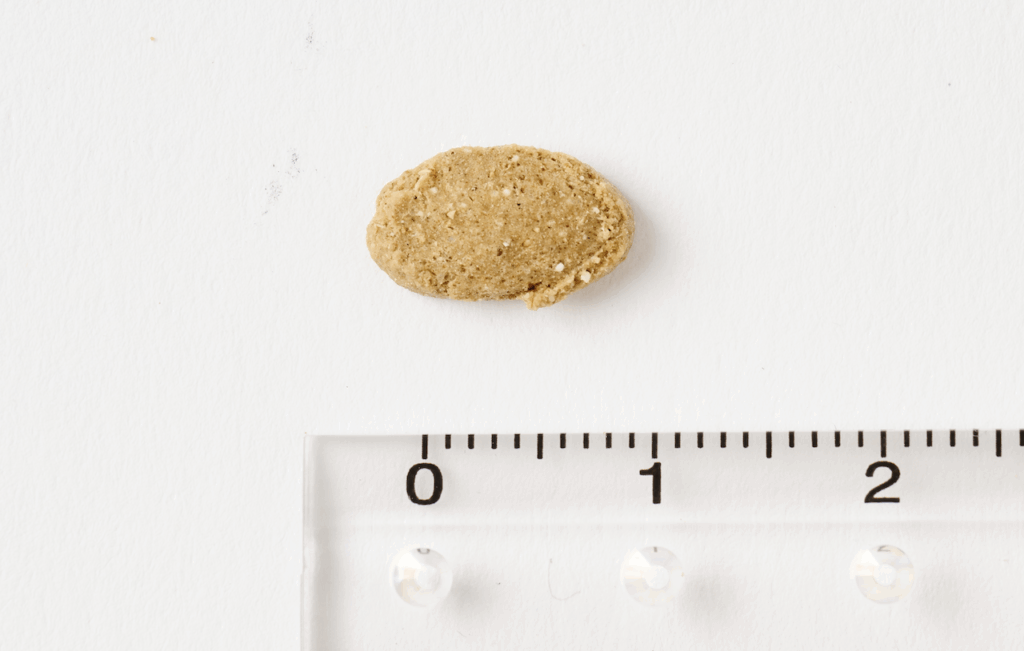 粒は硬すぎず、指で少し力を加えればわずかにしなる程度。小型犬や噛む力の弱い子でも食べやすそうな設計です。