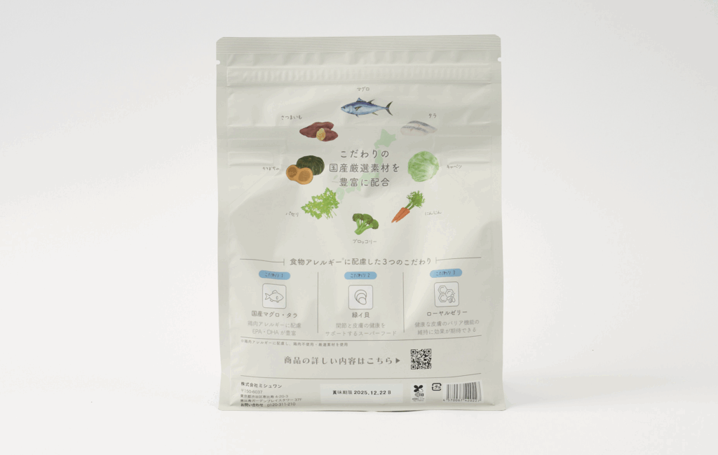 本製品は国産のマグロとタラのみを動物性たんぱく源として使用し、鶏肉や牛肉、小麦などのアレルゲンになりやすい原料は一切不使用。