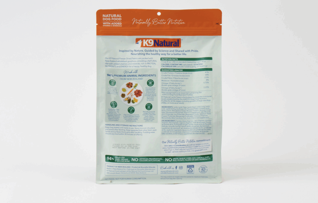 主原料はニュージーランド産の放牧ラムと内臓類。野菜や緑イ貝なども加えられた高栄養設計で、原産国・製造国ともにニュージーランドです。製造はK9ナチュラル社が一貫して行っており、品質管理も徹底されています。