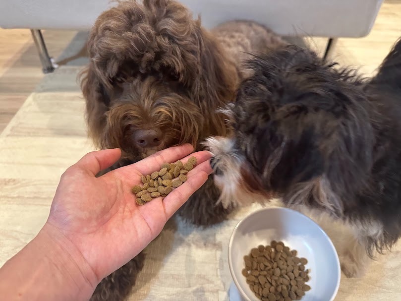 わが家の子犬の小型犬と成犬の中型犬に与えてみると、香りを確認するやいなや、2匹とも勢いよくパクパク食べ始めて、あっという間に完食。特に子犬の子は小粒で食べやすかったのか、驚くほどの食いつきを見せてくれました。