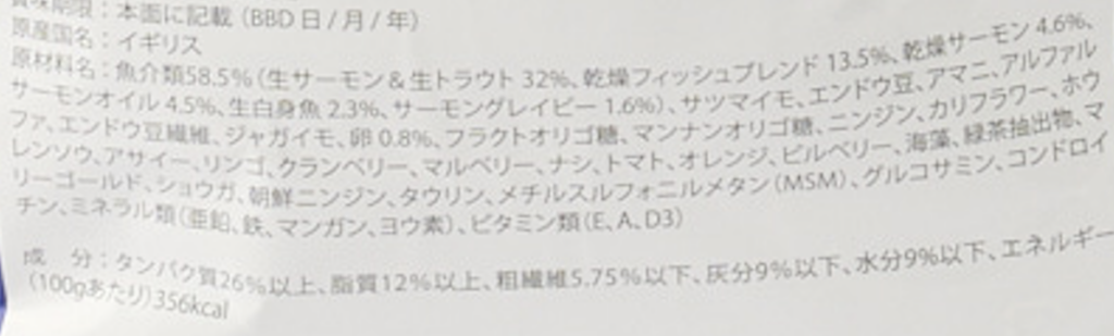 魚介類58.5%(生サーモン&生トラウト32%、乾燥フィッシュブレンド13.5%、乾燥サーモン4.6%、サーモンオイル4.5%、生白身魚2.3%、サーモングレイビー1.6%)、サツマイモ、エンドウ豆、アマニ、アルファルファ、エンドウ豆繊維、ジャガイモ、卵0.8%、フラクトオリゴ糖、マンナンオリゴ糖、ニンジン、カリフラワー、ホウレンソウ、アサイー、リンゴ、クランベリー、マルベリー、ナシ、トマト、オレンジ、ビルベリー、海藻、緑茶抽出物、マリーゴールド、ショウガ、朝鮮ニンジン、タウリン、メチルスルフォニルメタン(MSM)、グルコサミン、コンドロイチン、ミネラル類(亜鉛、鉄、マンガン、ヨウ素)、ビタミン類(E、A、D3)
