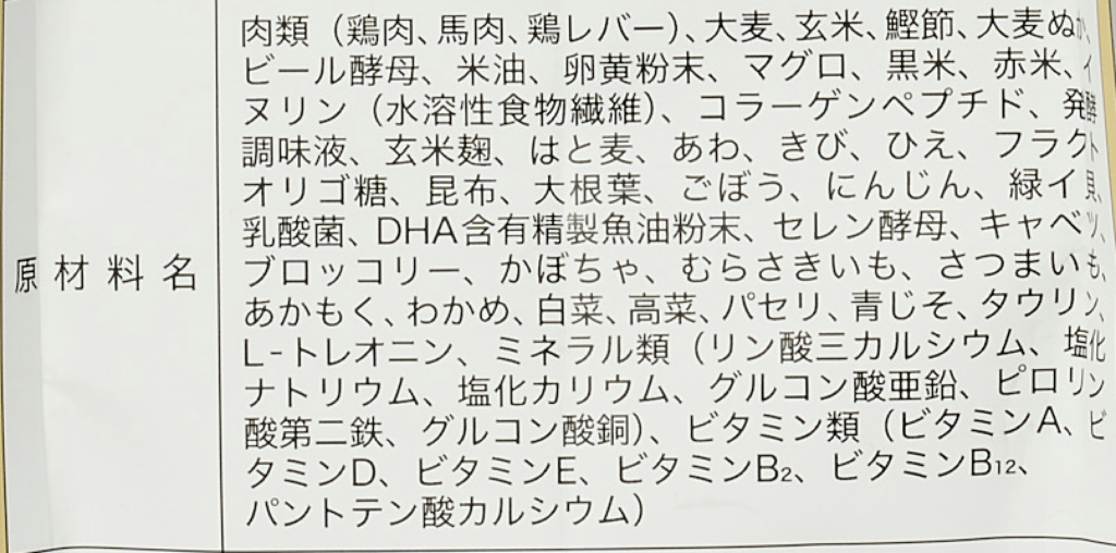 肉類(鶏肉、馬肉、鶏レバー)、大麦、玄米、鰹節、大麦ぬか、ビール酵母、米油、卵黄粉末、マグロ、黒米、赤米、イヌリン(水溶性食物繊維)、コラーゲンペプチド、発酵調味液、玄米麹、はと麦、あわ、きび、ひえ、フラクトオリゴ糖、昆布、大根葉、ごぼう、にんじん、緑イ貝、乳酸菌、DHA含有精製魚油粉末、セレン酵母、キャベツ、ブロッコリー、かぼちゃ、むらさきいも、さつまいも、あかもく、わかめ、白菜、高菜、パセリ、青じそ、タウリン、Lートレオニン、ミネラル類(リン酸三カルシウム、塩化ナトリウム、塩化カリウム、グルコン酸亜鉛、ピロリン酸第二鉄、グルコン酸銅)、ビタミン類(ビタミンA、ビタミンD、ビタミンE、ビタミンB2、ビタミンB12、パントテン酸カルシウム)