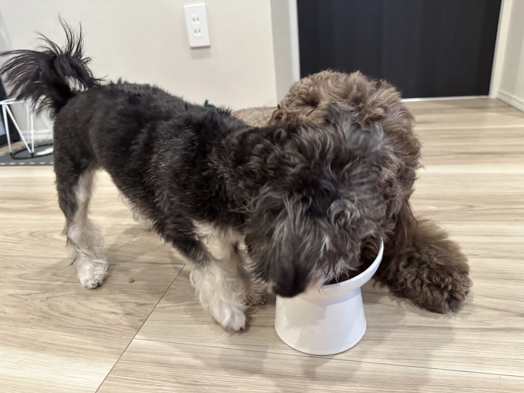 今回、子犬のシュナウザー×マルチーズ(小型犬)と成犬のプードル×イングリッシュスプリンガー(中型犬)に「ペルシア ドッグフード オールミックス」を与えてみました。その実際の様子や身体の変化についてレビューします。