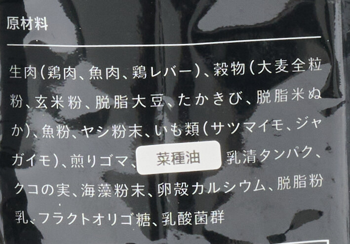 生肉(鶏肉、魚肉、鶏レバー)、穀物(大麦全粒粉、玄米粉、脱脂大豆、たかきび、脱脂米ぬか)、魚粉、ヤシ粉末、いも類(サツマイモ、ジャガイモ)、煎りゴマ、菜種油、乳清タンパク、クコの実、海藻粉末、卵殻カルシウム、脱脂粉乳、フラクトオリゴ糖、乳酸菌群