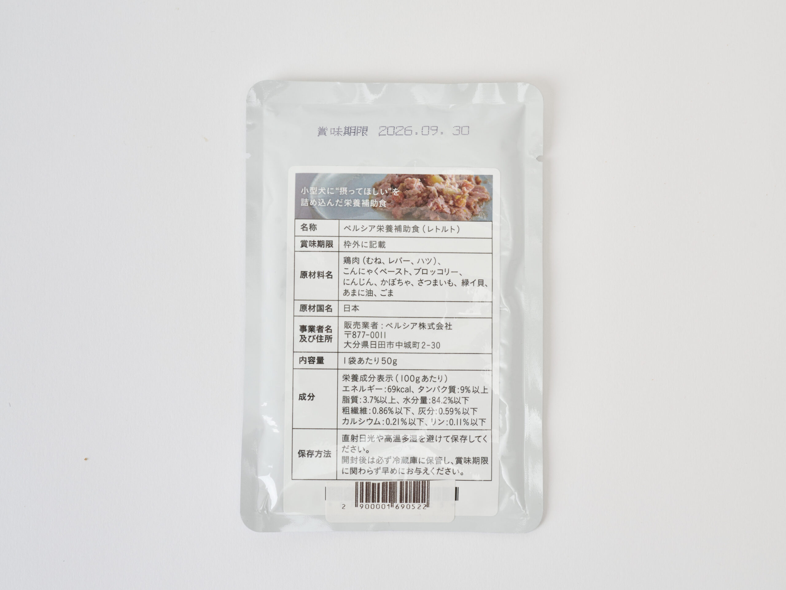 「ペルシア トッピングフード」は、1袋50gの少量パックになっています。愛犬の健康状態や年齢にもよりますが、1日で食べきれるくらいの量なので、いつでも新鮮なトッピングフードを与えられるでしょう。