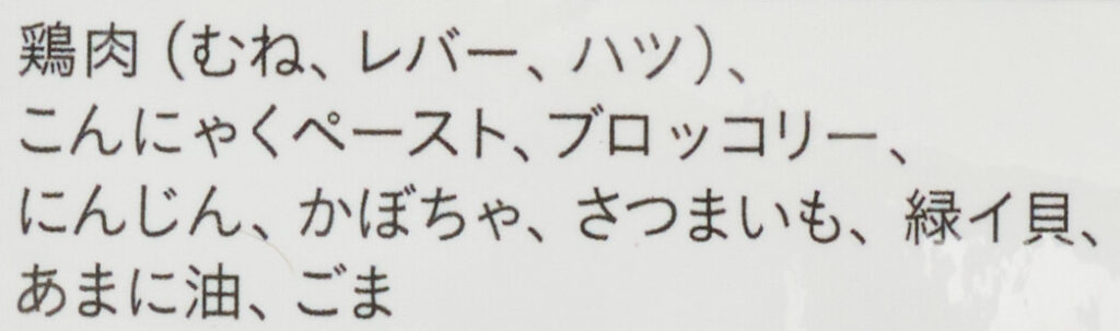 鶏肉(むね、レバー、ハツ)、こんにゃくペースト、ブロッコリー、にんじん、かぼちゃ、さつまいも、緑イ貝、あまに油、ごま