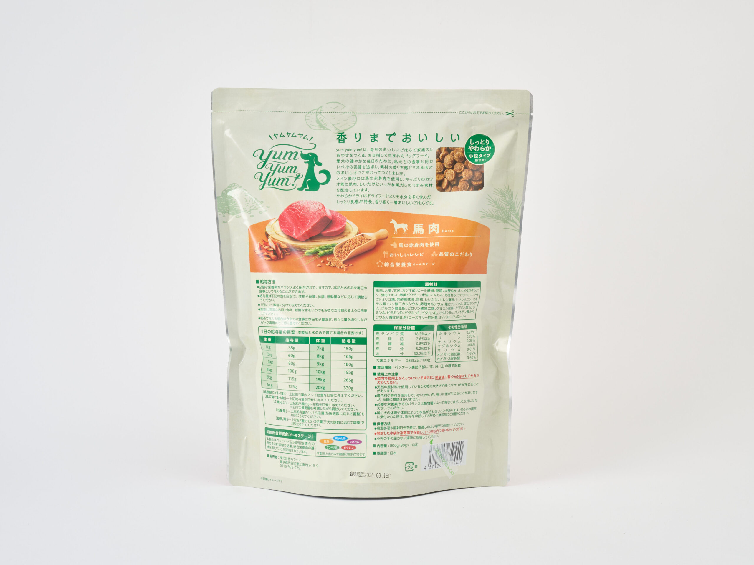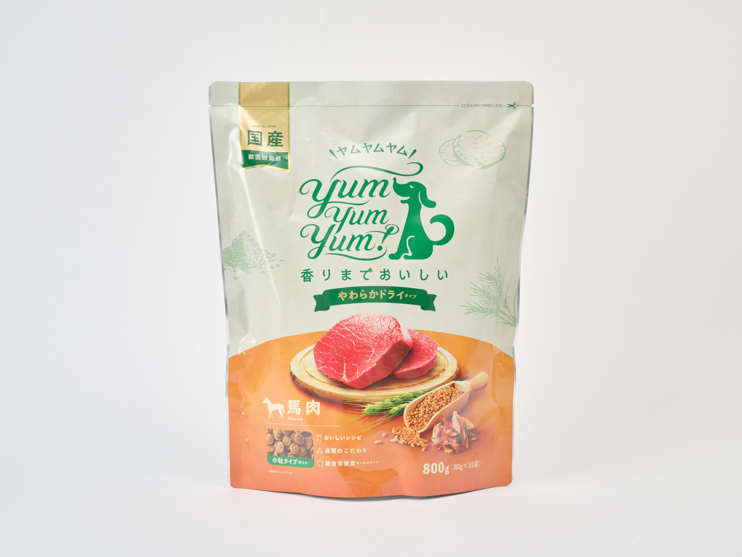 全年齢・全犬種対応の総合栄養食として、幅広い愛犬に最適な「ヤムヤムヤム 馬肉 やわらかドライタイプ」は、和風だしの旨味と優しい香りが引き立つレシピです。オリゴ糖やビタミン類なども配合されているため栄養バランスも良く、小粒タイプで子犬やシニア犬でも食べやすい設計になっています。