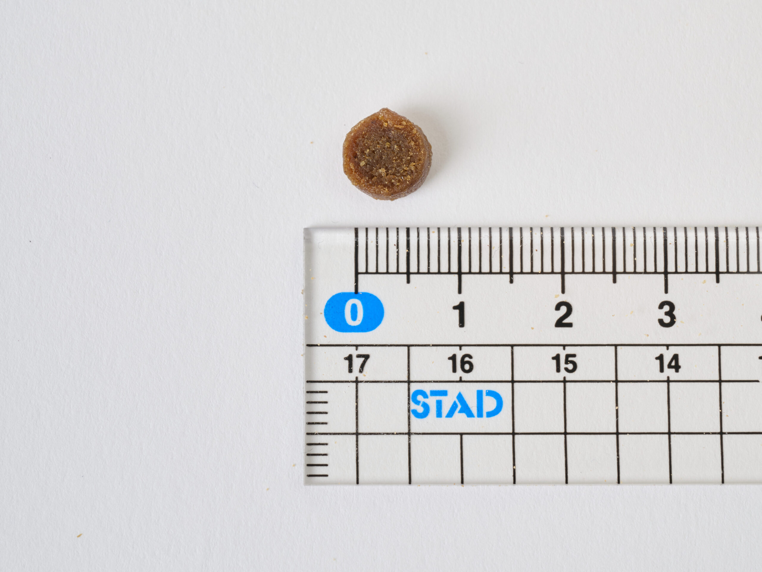 粒サイズは約直径0.6~0.7cm程度の小粒タイプで、小型犬でもアゴに負担なく食べられる大きさです。特にアゴの小さな小型犬や偏食傾向の子におすすめと公式サイトでも謳われています。
