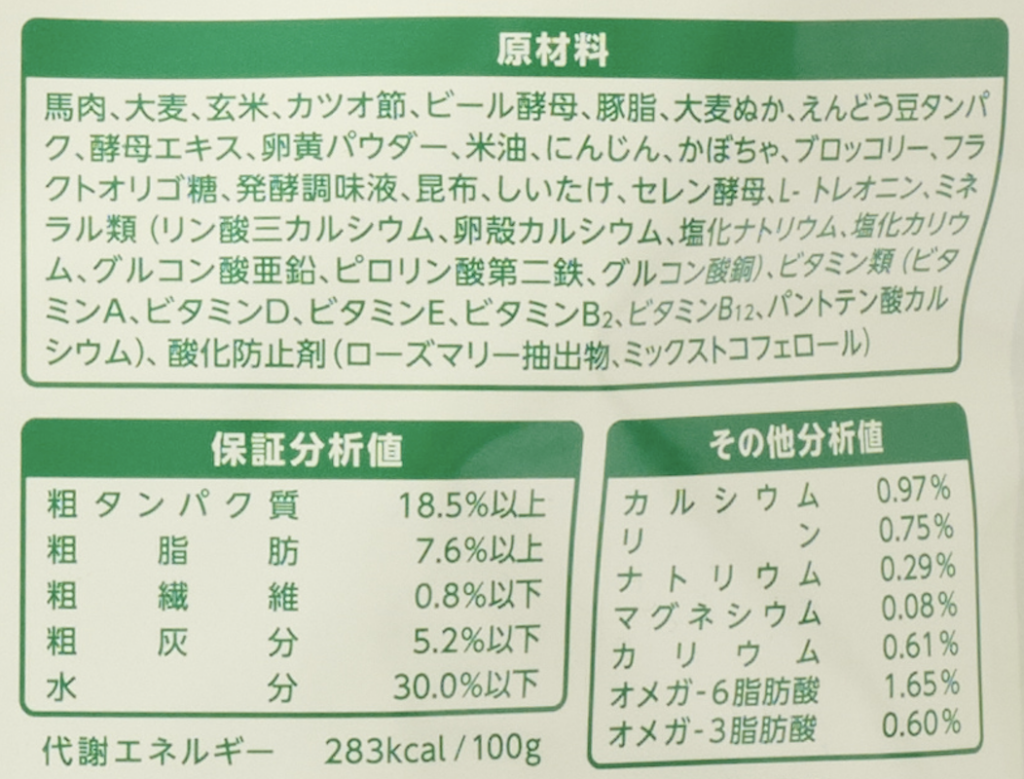 馬肉、大麦、玄米、カツオ節、ビール酵母、豚脂、大麦ぬか、えんどう豆タンパク、酵母エキス、卵黄パウダー、米油、にんじん、かぼちゃ、ブロッコリー、フラクトオリゴ糖、発酵調味液、昆布、しいたけ、セレン酵母、L-トレオニン、ミネラル類(リン酸三カルシウム、卵殻カルシウム、塩化ナトリウム、塩化カリウム、グルコン酸亜鉛、ピロリン酸第二鉄、グルコン酸銅)、ビタミン類(ビタミンA、ビタミンD、ビタミンE、ビタミンB2、ビタミンB12、パントテン酸カルシウム)、酸化防止剤(ローズマリー抽出物、ミックストコフェロール)