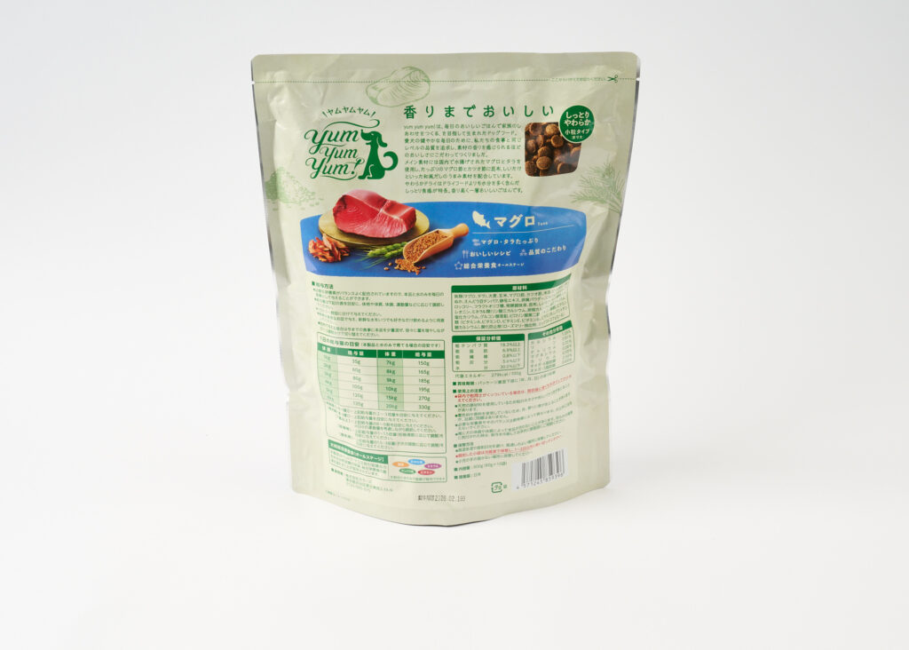 「ヤムヤムヤム マグロ やわらかドライタイプ」は全犬種・全年齢適応の総合栄養食です。魚と穀物を主原料にしており、粗タンパク質18.3%以上、粗脂肪6.9%以上の理想的な栄養比率になっています。