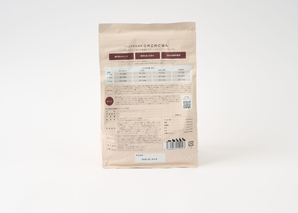シニア犬になると、加齢による身体機能の変化が少しずつ現れてきます。歯や噛む力、食欲の低下、関節や被毛・目のトラブル、代謝の低下による体重管理の難しさなど。こうした変化にしっかり対応できるよう設計されたのが、この「シニアのためのこのこのごはん」です。