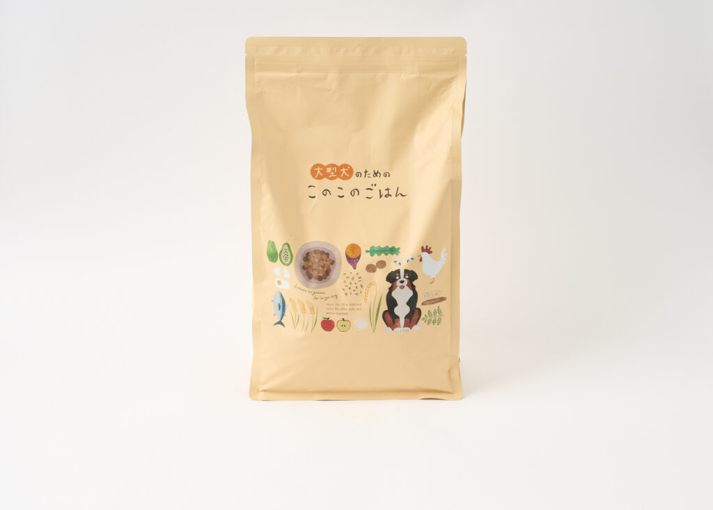 「大型犬のためのこのこのごはん」は、原材料に鶏肉とマグロを使用しており、可能な限り国産の材料を厳選し、製造も国内工場でおこなわれています。また、1袋3kgと大容量での販売が基本です。これは、大型犬のフードの消費量に配慮しており、すぐに食べきってなくなってしまう心配もありません。