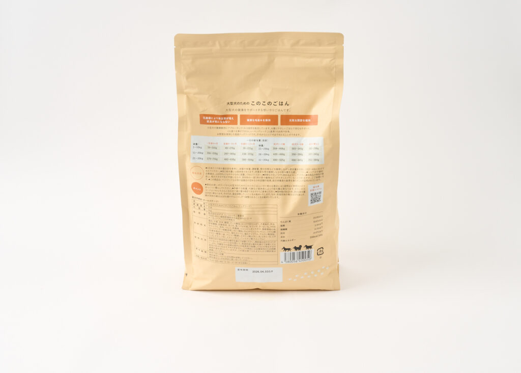 一般的なフードと比較しても、通常の1袋で3kgの容量は多い傾向です。大型犬は、体重に比例して必要なエネルギーや栄養素が多くなるため、中型犬や小型犬より1回の食事量も増えます。「大型犬のためのこのこのごはん」は、大型犬の特徴を正しく把握しているからこそ、1袋の容量も考慮されています。
