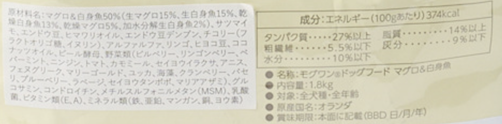 「モグワン マグロ&白身魚」は、パッケージに原材料が細かく記されています。栄養価の高いマグロと消化に優しい白身魚をブレンドしたフードです。また、グレインフリー設計のため、サツマイモやエンドウ豆を主原料にしています。