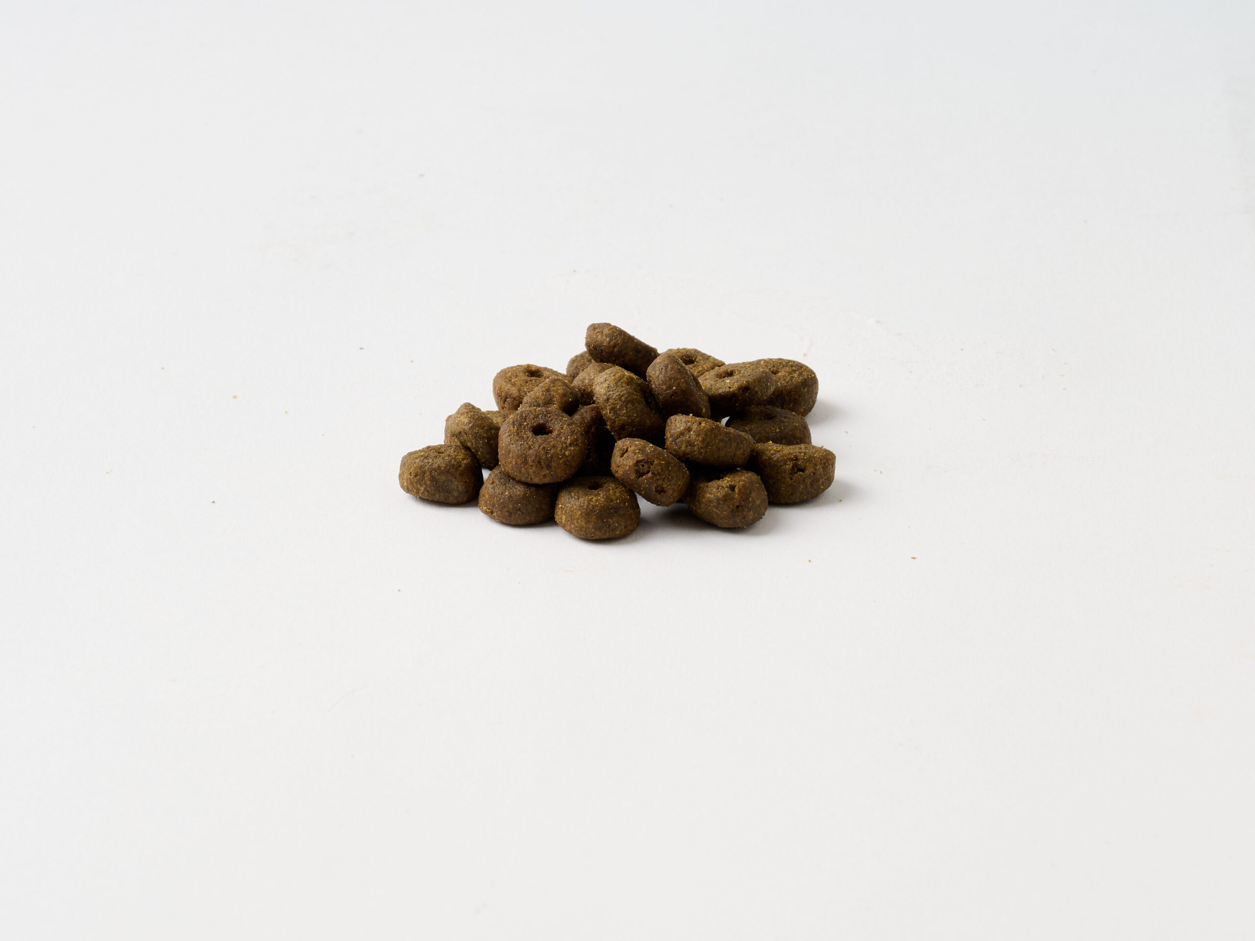 香りが強く嗜好性が高いので、偏食気味や少食の子でも食欲をそそりやすく、食いつきの良さが特徴です。粒は小粒かつドーナツ型で、噛みやすく丸呑みしにくい形状のため、小型犬や子犬、歯が弱いシニア犬にも食べやすい設計になっています。