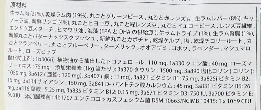 生ラム肉 (21%), ラムミール (19%), 丸ごとグリーンピース, 丸ごと赤レンズ豆, 生ラムレバー (8%), キャノーラ油, 新鮮リンゴ (4%), 丸ごとヒヨコ豆, 丸ごと緑レンズ豆, 丸ごとイエローピース, レンズ豆繊維, エンドウ豆スターチ, ヒマワリ油, 海藻 (EPAとDHAの供給源), 生ラムトライプ (1%), 生ラム腎臓 (1%), 新鮮丸ごとバターナッツスクワッシュ, 新鮮丸ごとカボチャ, 乾燥ケルプ, 塩, 乾燥チコリールート, 丸ごとクランベリー, 丸ごとブルーベリー, ターメリック, オオアザミ, ゴボウ, ラベンダー, マシュマロルート, ローズヒップ 酸化防止剤: 1b306(i) 植物油から抽出したトコフェロール: 110 mg, 1a330 クエン酸: 40 mg, ローズマリーエキス: 75 mg 添加栄養素(1kg当たり): 3a370 タウリン: 1500 mg, 3a890 塩化コリン (コリン): 1050 mg, 3b612 (亜鉛: 120 mg), 3b407 (銅: 11 mg), 3a821 ビタミンB1: 75 mg, 3a825i ビタミンB2: 15 mg, 3a314 ナイアシン: 150 mg, 3a841 D-パントテン酸カルシウム: 45 mg, 3a831 ビタミンB6: 26 mg, 3a316 葉酸: 5.25 mg, 3a835 ビタミンB12: 0.15 mg, 3a671 ビタミンD3: 750 IU, 3a700 ビタミンE: 500 IU 添加腸球菌: 4b1707 エンテロコッカスフェシウム菌 DSM 10663/NCIMB 10415: 1 x 109 CFU