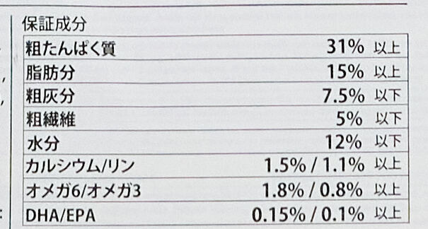 | 粗たんぱく質 | 31%以上 | 脂肪分 | 15%以上 |