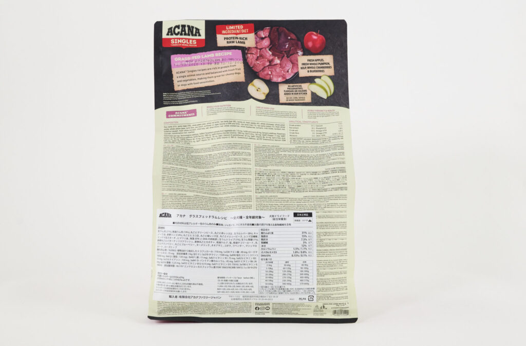 「アカナ グラスフェッドラム」は外国産のドッグフードです。そのため、パッケージ裏面の説明などは英語やフランス語など様々な国の言語で記載されていますが、原材料やカロリーなど、日本語での表記シールがあるため、海外の言語が苦手な方でも安心です。
