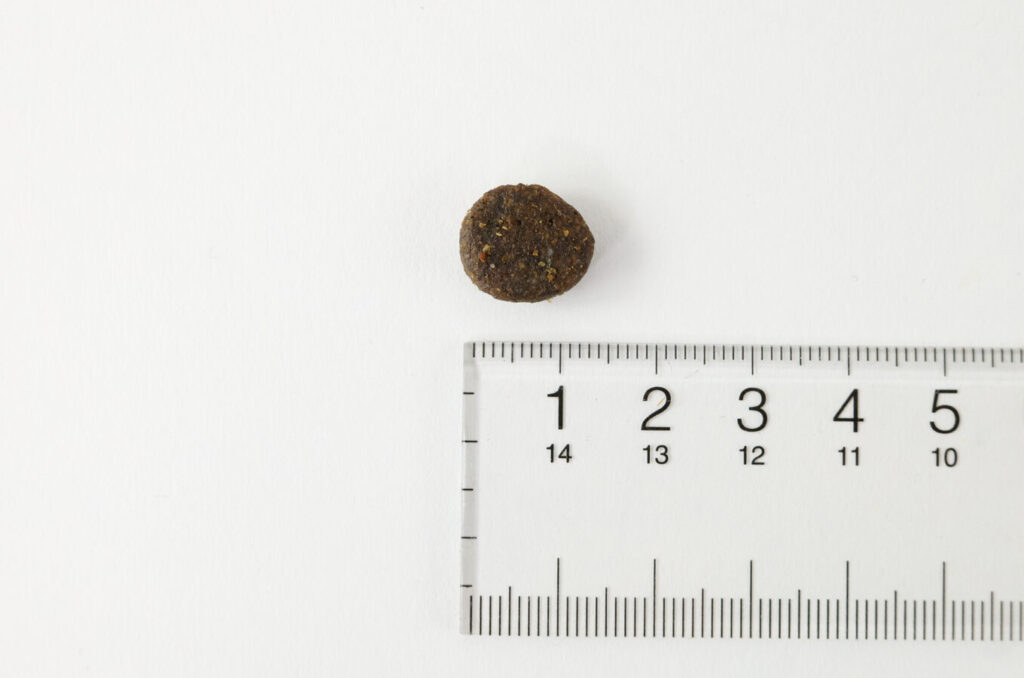 粒はやや大きめで厚みもあり、密度がしっかりしています。小型犬には少し大きく感じるサイズ感ですが、噛みながら問題なく完食。ただし、口のかなり小さな超小型犬の場合は食べづらさを感じる可能性があるため注意が必要です。