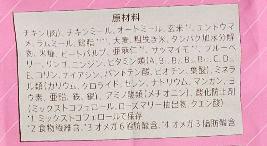 チキン(肉)、チキンミール、オートミール、玄米*2、エンドウマメ、ラムミール、鶏脂*1*3、大麦、粗挽き米、タンパク加水分解物、米糠、ビートパルプ、亜麻仁*4、サツマイモ*2、ブルーベリー、リンゴ、ニンジン、ビタミン類(A、B1、B2、B6、B12、C、D3、E、コリン、ナイアシン、パントテン酸、ビオチン、葉酸)、ミネラル類(カリウム、クロライド、セレン、ナトリウム、マンガン、ヨウ素、亜鉛、鉄、銅)、アミノ酸類(メチオニン)、酸化防止剤(ミックストコフェロール、ローズマリー抽出物、クエン酸) *1 ミックストコフェロールで保存 *2 食物繊維含、*3 オメガ6脂肪酸含、*4 オメガ3脂肪酸含