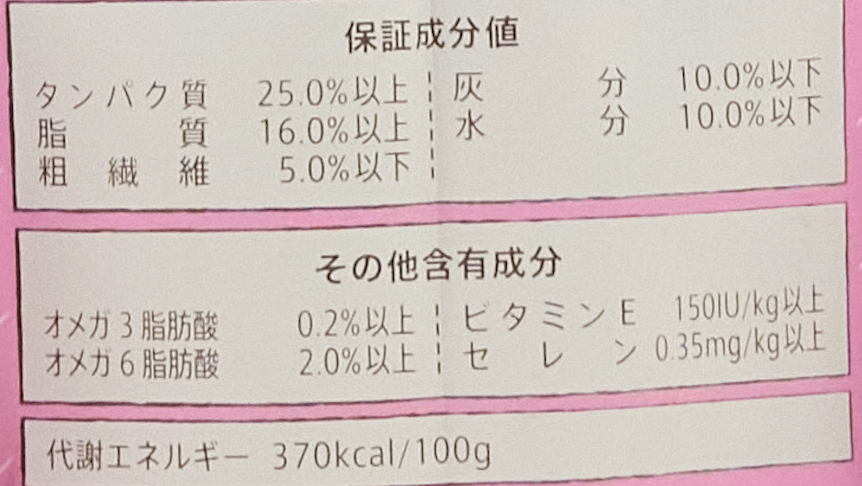 | たんぱく質 | 25.0%以上 | 脂質 | 16.0%以上 |